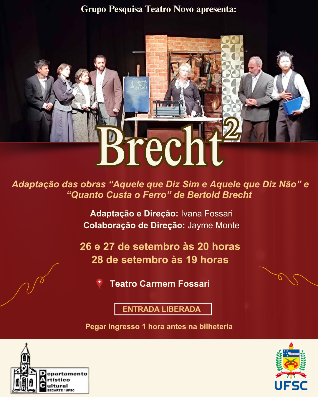 Quanto: Entrada gratuita, com retirada de ingressos uma hora antes do início do espetáculo na bilheteria do teatro, ou antecipadamente pela plataforma Sympla.